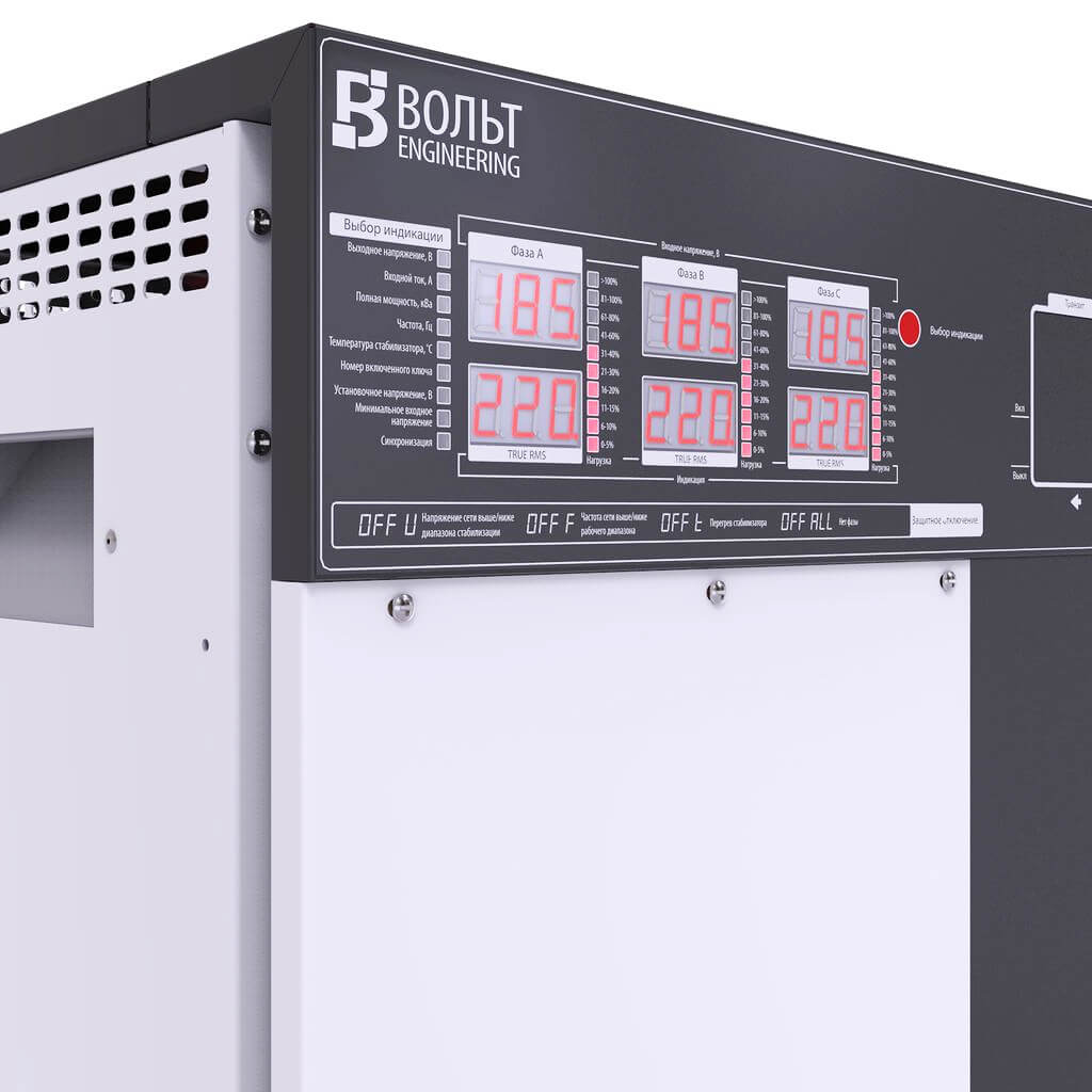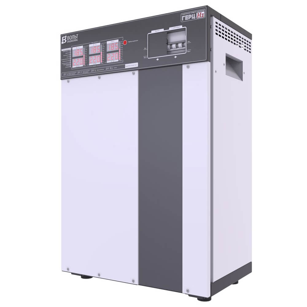Стабилизатор напряжения Вольт Engineering Герц Э 16-3/63 предназначен для устранения скачков и просадок напряжения в бытовых и промышленных трехфазных электросетях. Стабилизатор является двухрежимным и в зависимости от выбранного режима работы может стабилизировать либо линейное напряжение 380/400В (для промышленности), либо фазное 220/230В на каждой фазе независимо (используются в быту).